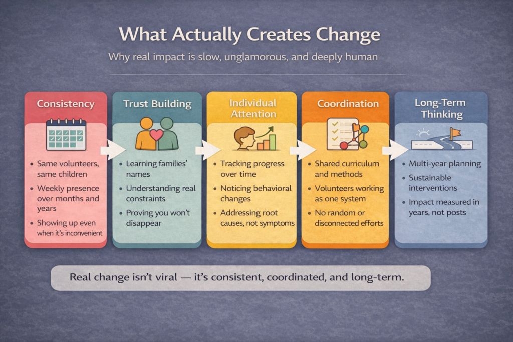 The volunteers weren’t bad people. They genuinely wanted to help. But they approached volunteering as an event rather than a commitment. They came for a day, a week, maybe a month. They provided surface-level help without addressing underlying problems. Then they left, often never to return.