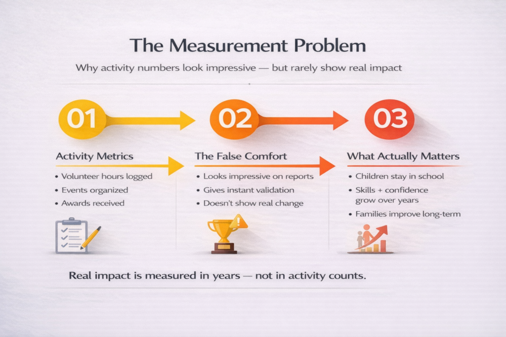 Most organizations use activity metrics: number of children enrolled, volunteer hours contributed, events organized, awards received. These numbers look impressive but reveal little about actual impact.